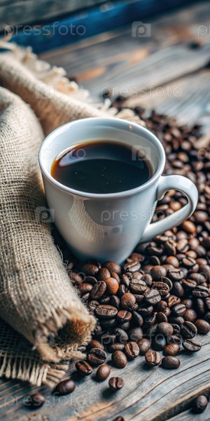 Белая чашка для кофе опирается на лоскут рядом с рассеянными кофейными зернами
