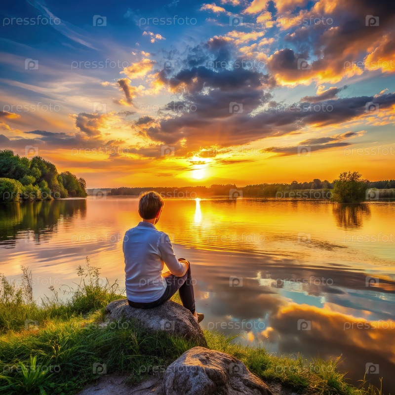 Человек, наблюдающий за ярким закатом солнца над спокойными водами в естественном ландшафте
