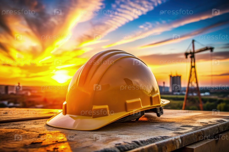 Потрясающий инженерный шлем опирается на деревянную поверхность, когда солнце заходит позади высоких зданий и линий электропередач, излучая яркие цвета по небу