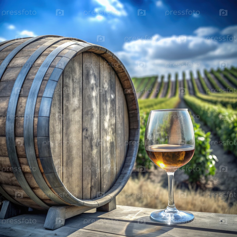 Стакан вина рядом с деревянной бочкой в винограднике под голубым небом