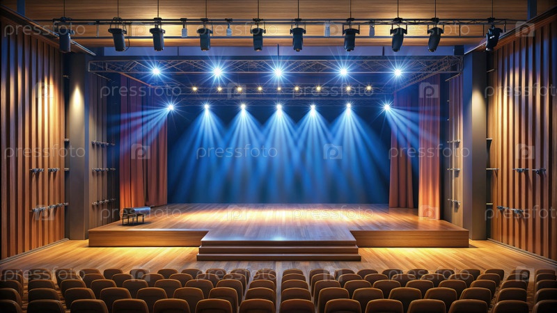 Пустая сцена со светофором и деревянным аудиторием в зале спектаклей на закате