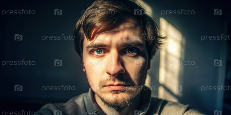 Спокойный человек с равномерным освещением, сидящий в помещении в спокойный момент