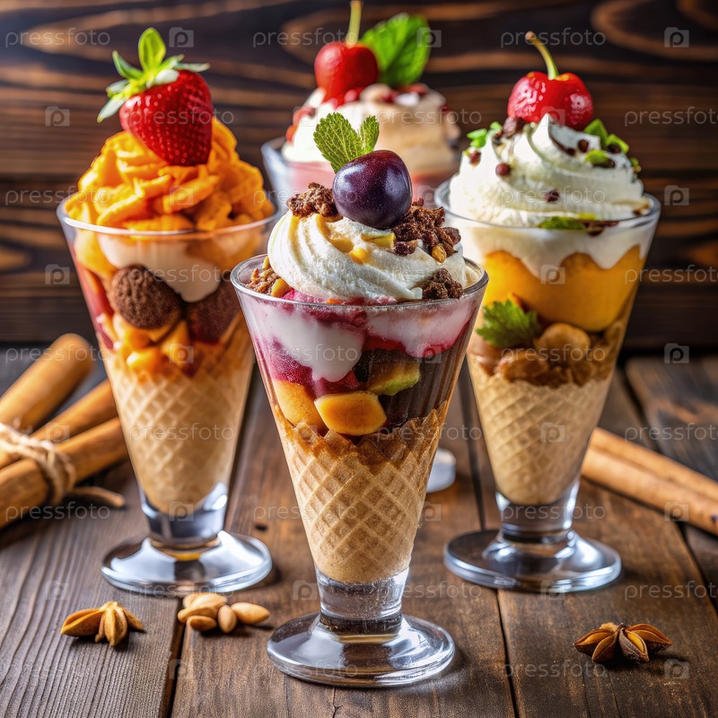 Красочные десертные чашки с фруктовыми начинками, подаваемые на деревянном столе
