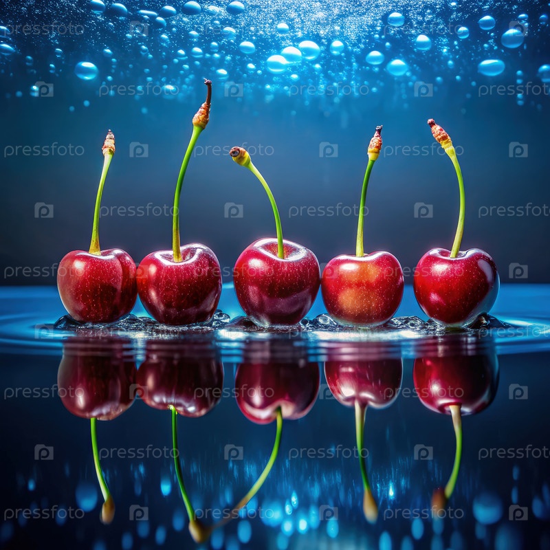 Пять вишен, погруженных в воду с пузырями и отражениями ночью