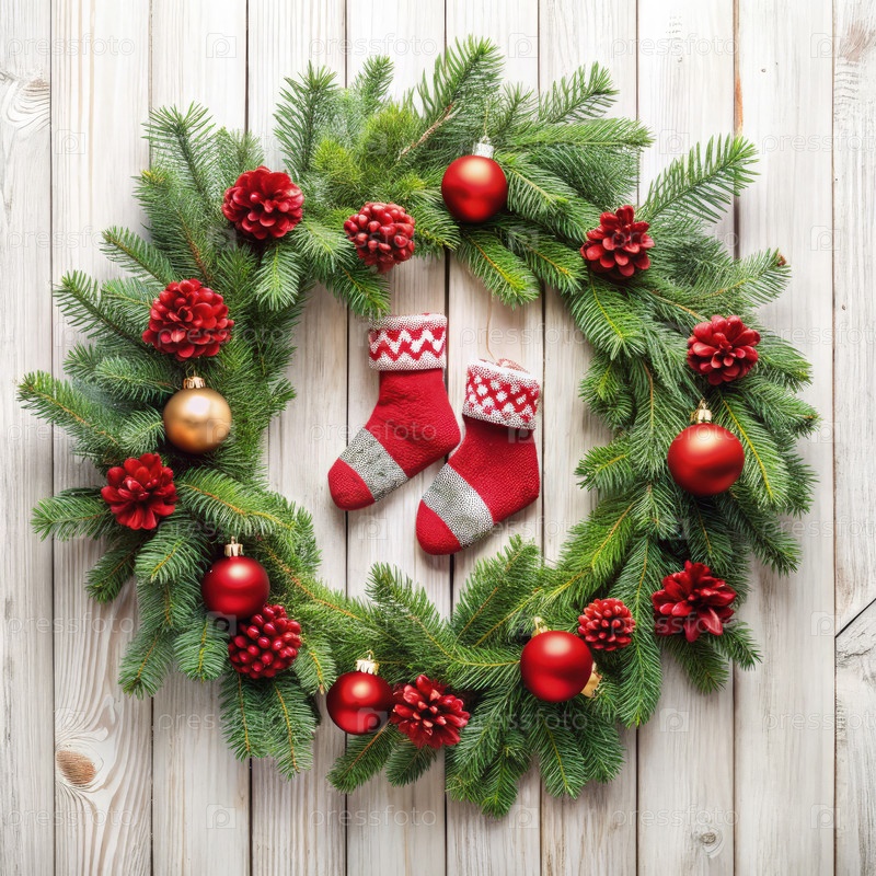 Красиво украшенный рождественский венок с украшенными орнаментами, сосновыми конусами и праздничными носками отображает праздничное настроение на деревянном фоне
