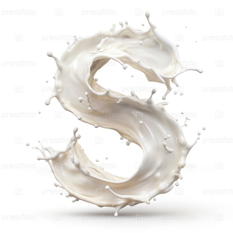 Стилизованная буква S, сформированная брызгами молока на белом фоне