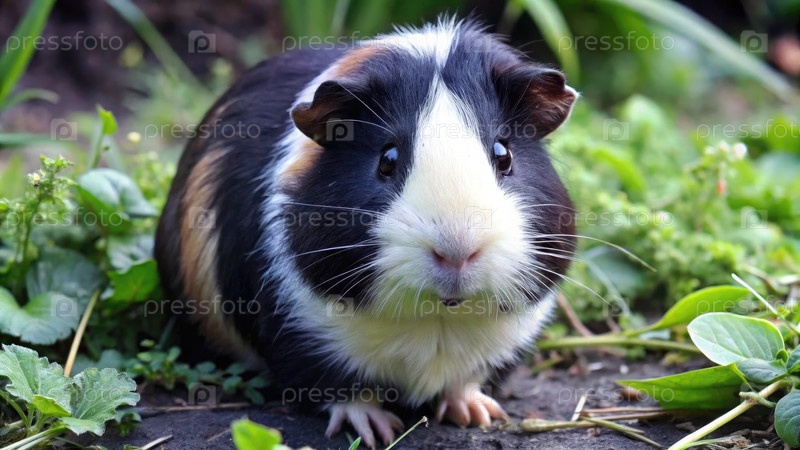 Морская свинка изучает зеленую траву и растения в солнечный день на заднем дворе