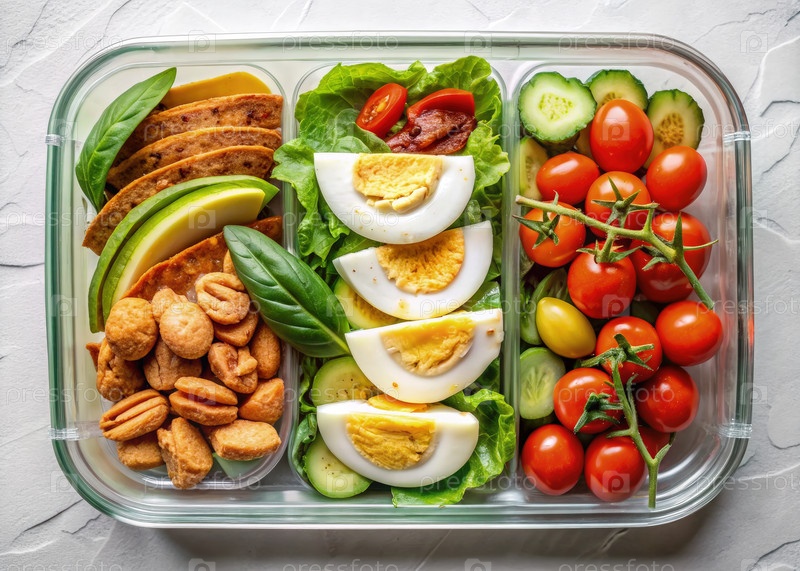 Сверху вниз вид здорового контейнера для приготовления обеденного блюда с различными свежими ингредиентами