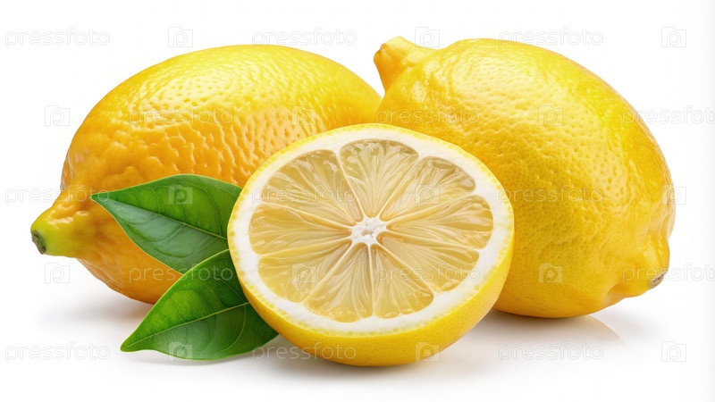 Целые и нарезанные лимоны с зелеными листьями на белом фоне