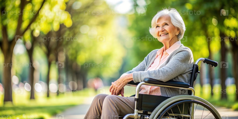 Счастливая пожилая женщина наслаждается солнечным днем в инвалидном кресле в парке