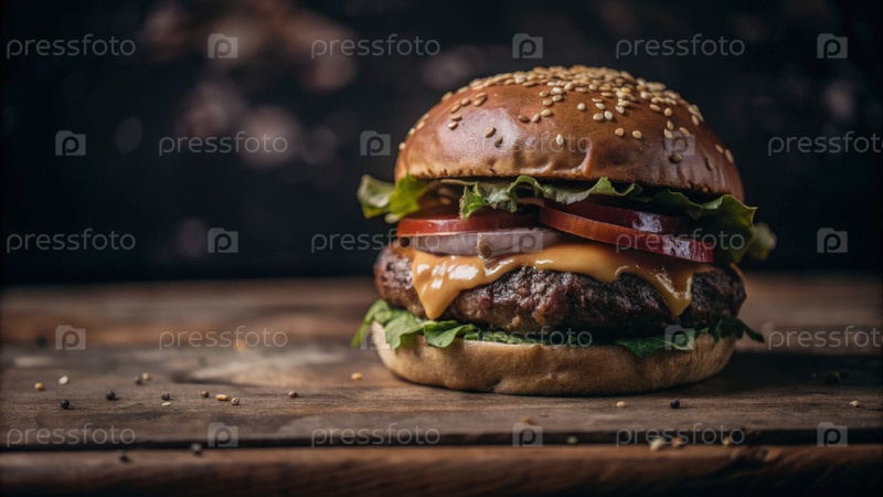 Вкусный крупный план свежесобранного гамбургера с сусамовым булочком, расплавленным сыром, салатами, помидорами и богатой говядиной на деревянном доске