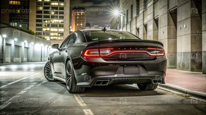 Потрясающий черный мускульный автомобиль, припаркованный ночью на слабо освещенной городской улице