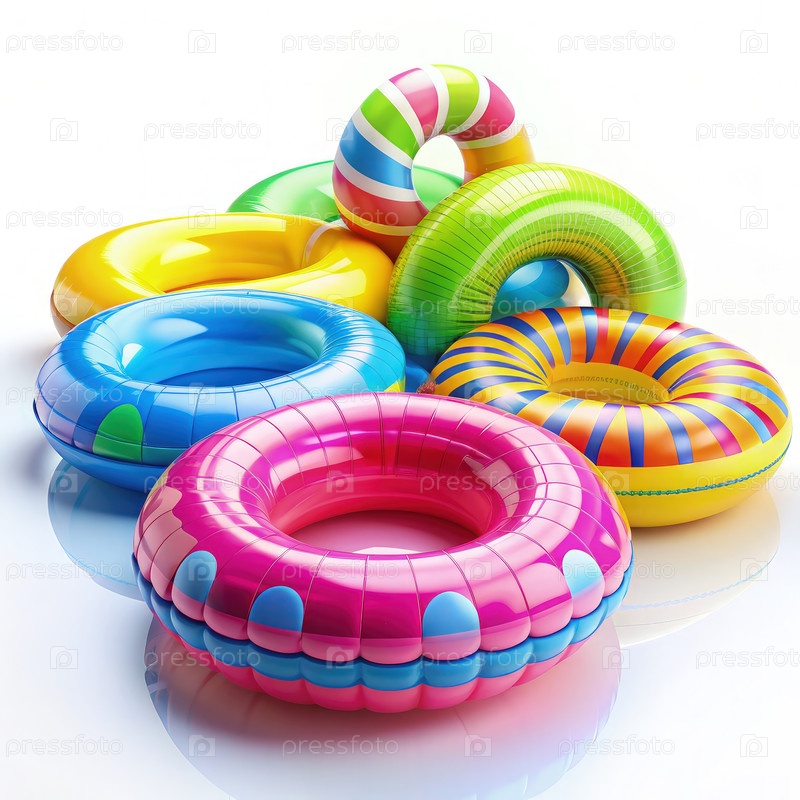 Яркая коллекция красочных надувных плавателей бассейна, расположенных вместе, идеально подходит для летнего веселья в бассейне в яркий солнечный день