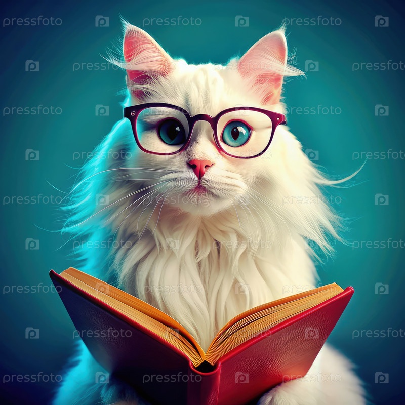 Милая длинношерстная белая кошка с очками, читающая стандартную шкалу в уютной обстановке
