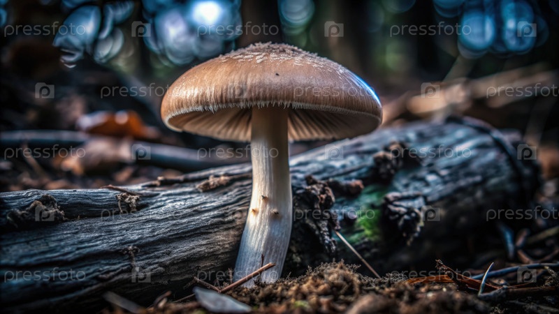 Близкий снимок гриба, растущего на бревне в лесу рано утром