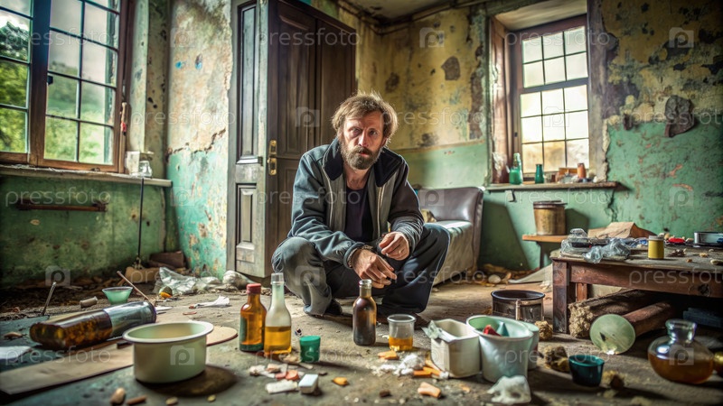 Мужчина сидит на полу в ветхой комнате, окруженной пустыми бутылками и мусором