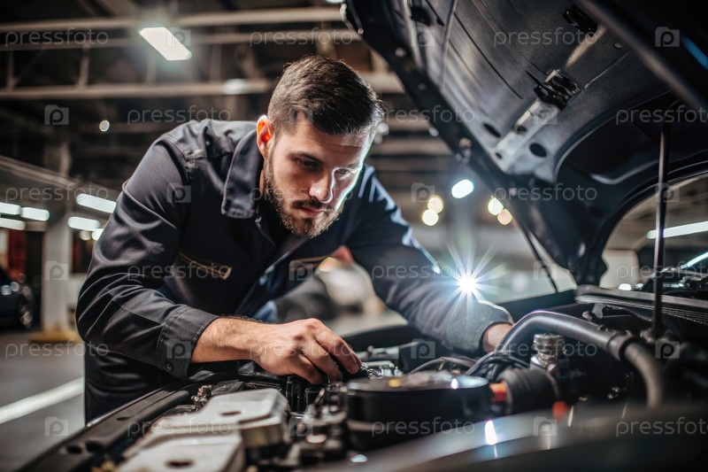 Техник, осматривающий двигатель автомобиля в автосервисе