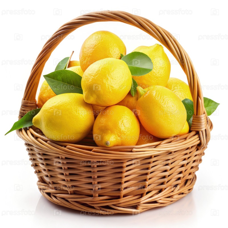 Свежие лимоны в корзине из уксуса на белом фоне