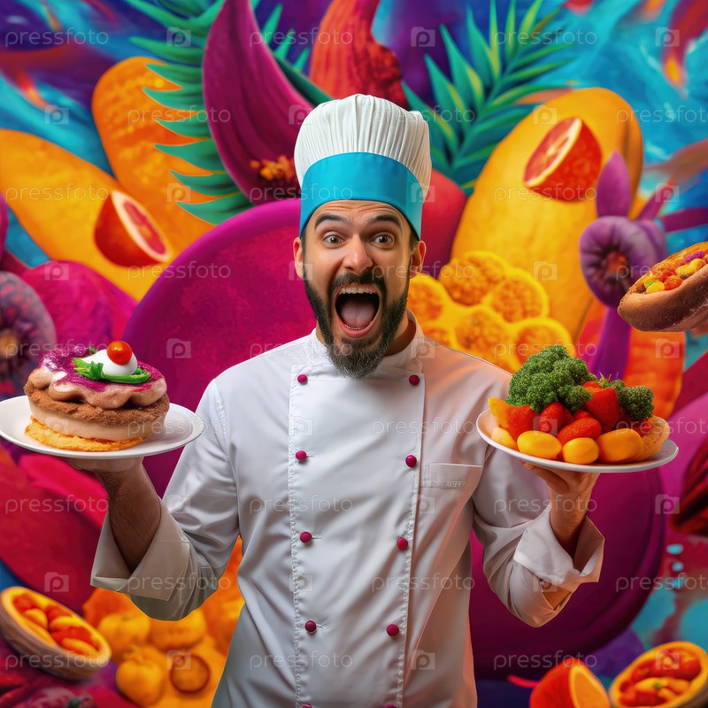 Шеф-повар радостно демонстрирует яркие блюда на красочном фруктовом фоне