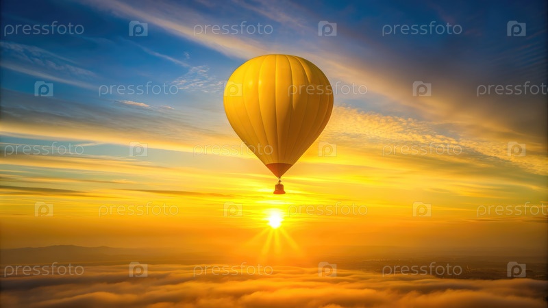 Один желтый воздушный шар поднимается высоко над облаками на закате