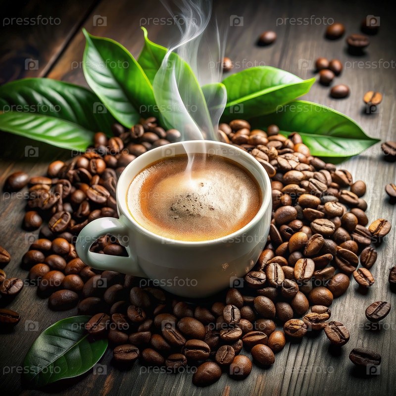 Свежая чашка с кофе в окружении бобов и листьев на деревянном столе