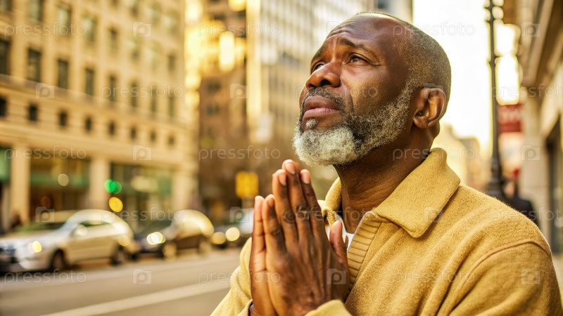 Мужчина молится на городской улице во время золотого часа