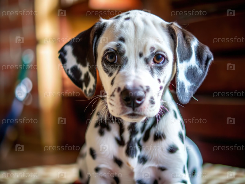 Милый далматинский щенк, сидящий внутри в уютной и теплой обстановке
