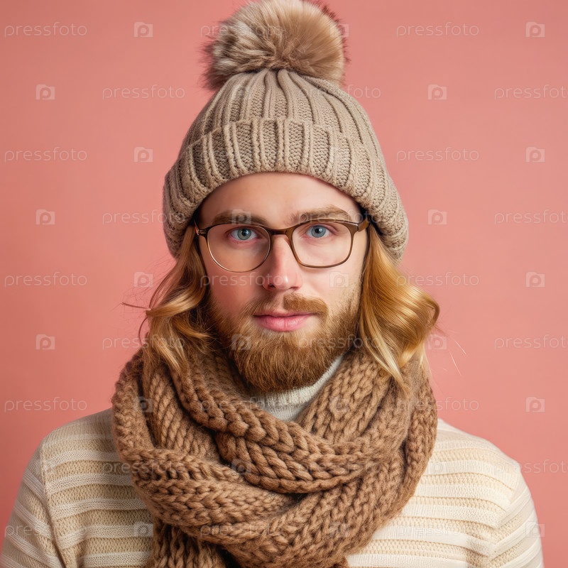 Стильный молодой человек, носящий вязанную шляпу и шарф на пастельном фоне