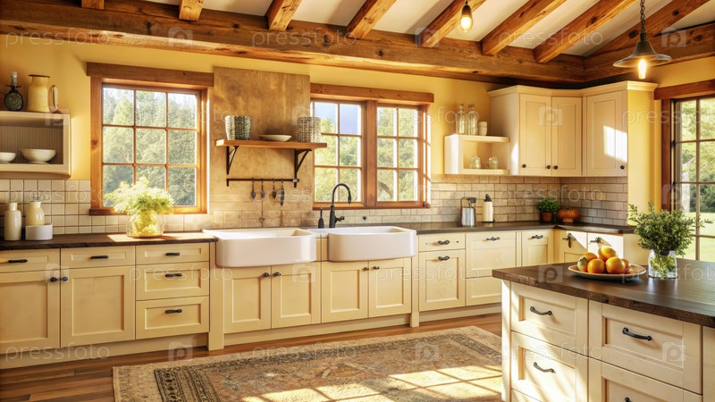 Рустическая фермерская кухня с белыми шкафами и деревянными балками на ярком солнечном свете