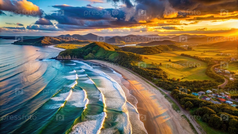 Вид с воздуха потрясающего берега моря при закате солнца с холмами и волнами на заднем плане