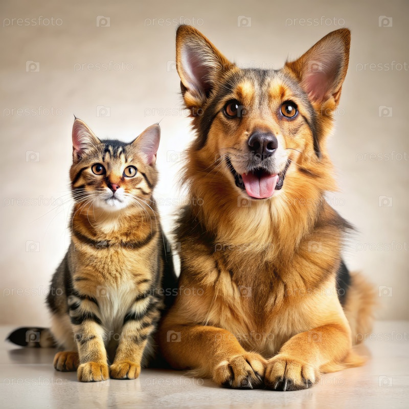 Кошка и собака сидят бок о бок, демонстрируя свою уникальную личность и игривые выражения в теплой помещенной обстановке днем