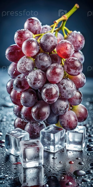 Свежие фиолетовые виноградные лозы с кубиками льда на темном фоне