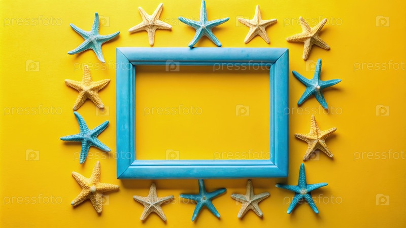 Яркая синяя рама, окруженная различными морскими звездами на ярко-желтом фоне, идеально подходит для выделения приморских воспоминаний или декора с тематикой пляжа