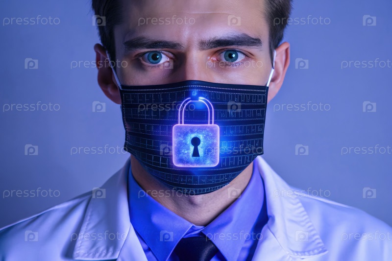 Стоматологический специалист, демонстрирующий стандарты защиты с помощью цифровой маски под замком