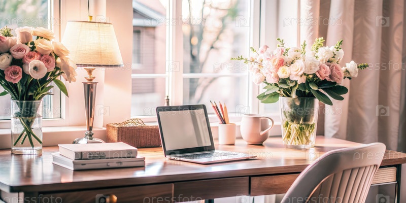 Уютная домашняя контора с свежими цветами и ноутбуком у окна в течение дня