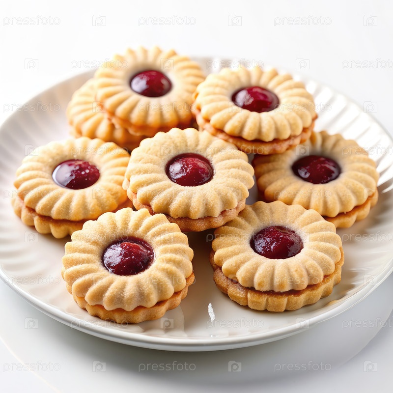 Вкусные печенье из короткого хлеба Kurabye, заполненное ягодным варенем на белой тарелке