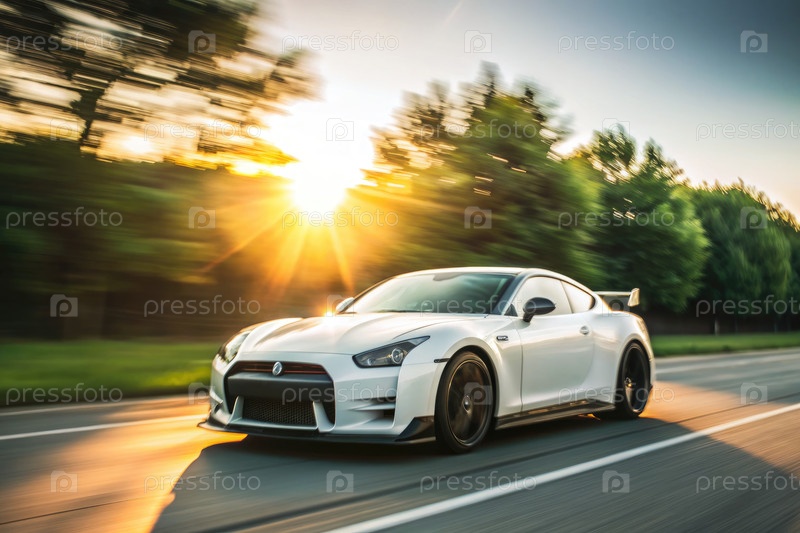 Белый спортивный автомобиль ускоряется вдоль асфальтированной дороги во время золотого часа