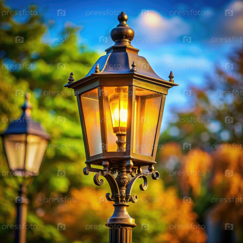 Живая уличная лампа, освещающая осенний парк во время золотого часа на закате