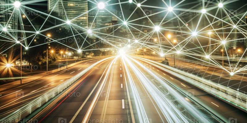 Цифровая трансформация, иллюстрирующая подключение на оживленной городской автомагистрали ночью