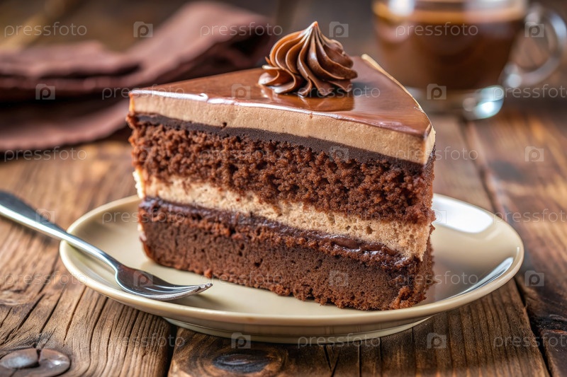 Вкусный шоколадно-кремовый кусок торта, подаваемый на тарелке с кофе рядом