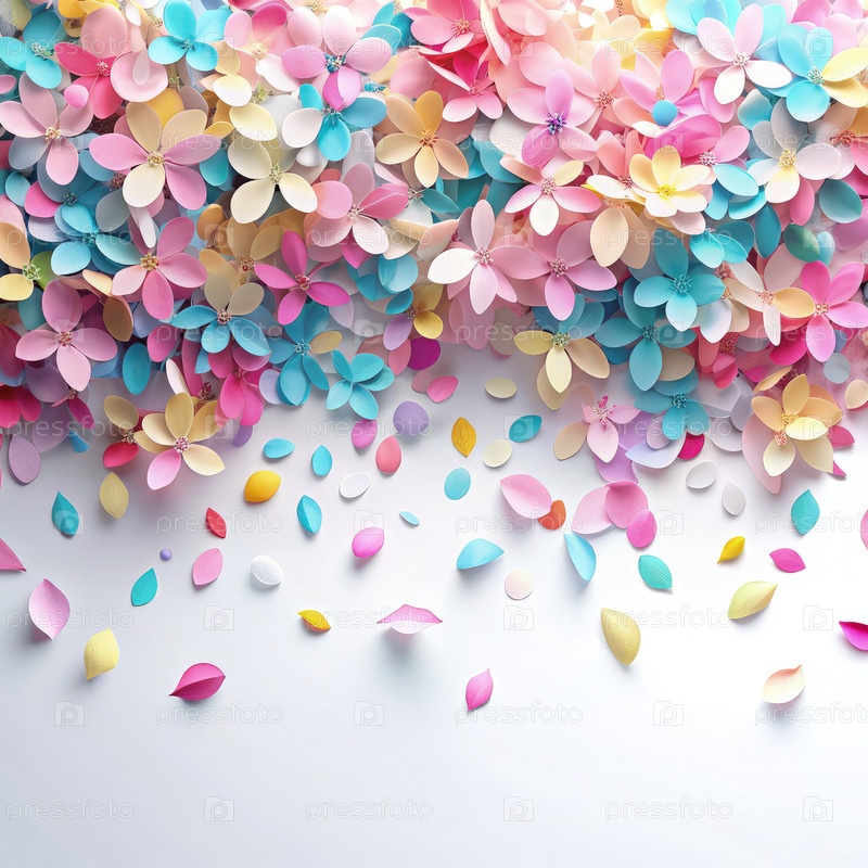 Красочный эффект конфетти с листьями пастельной бумаги, разбросанными на белом фоне, создавая праздничную и веселую атмосферу для торжеств или ремесленных проектов