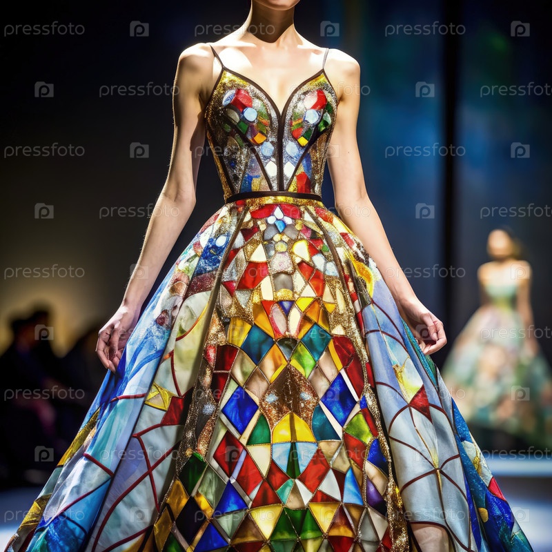 Элегантный дизайн платья с красочными зеркальными отражениями на модели взлетно-посадочной полосы