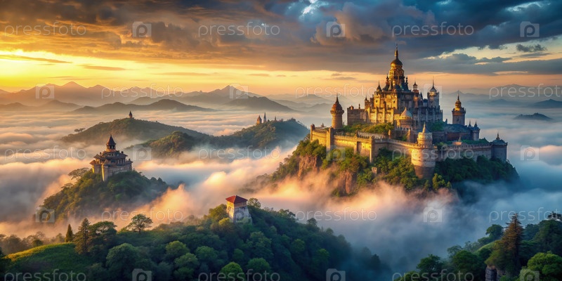 Расширенный вид на древний замок на горе, окруженный туманом при закате солнца, подчеркивая сложную архитектуру и естественную красоту пейзажа