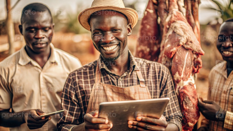 Мясники на работе на оживленном африканском рынке, демонстрируя свежее мясо и технологии