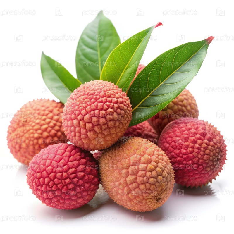 Свежие фрукты личи с ярко-зелеными листьями на белом фоне