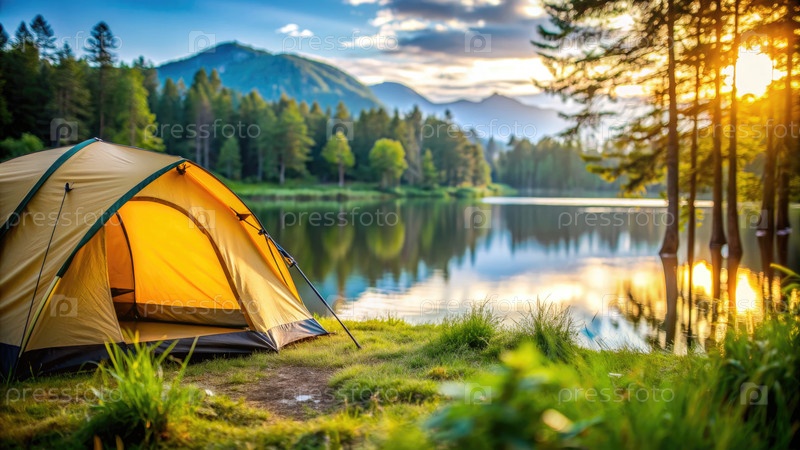 Спокойный опыт кемпинга у тихого озера во время заката в горах