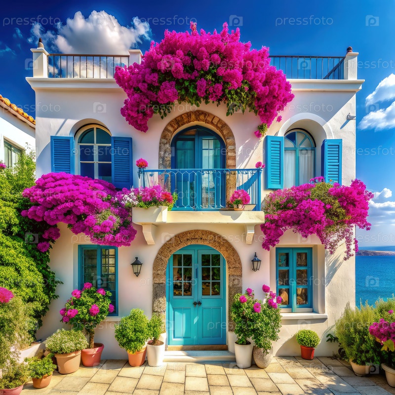 Красивый греческий дом с буганвильями, с видом на песчаный пляж