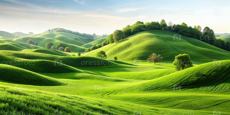 Плодоносящие зеленые холмы под чистым небом в безмятежной пейзажной обстановке