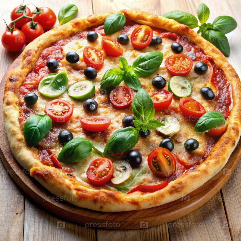 Свежевыпеченная овощная пицца с помидорами и базиликом на деревянном столе