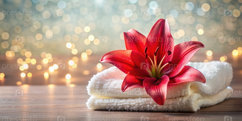 Деликатный цветок розовой лилии изящно помещен на мягкое полотенце в спа-устройстве